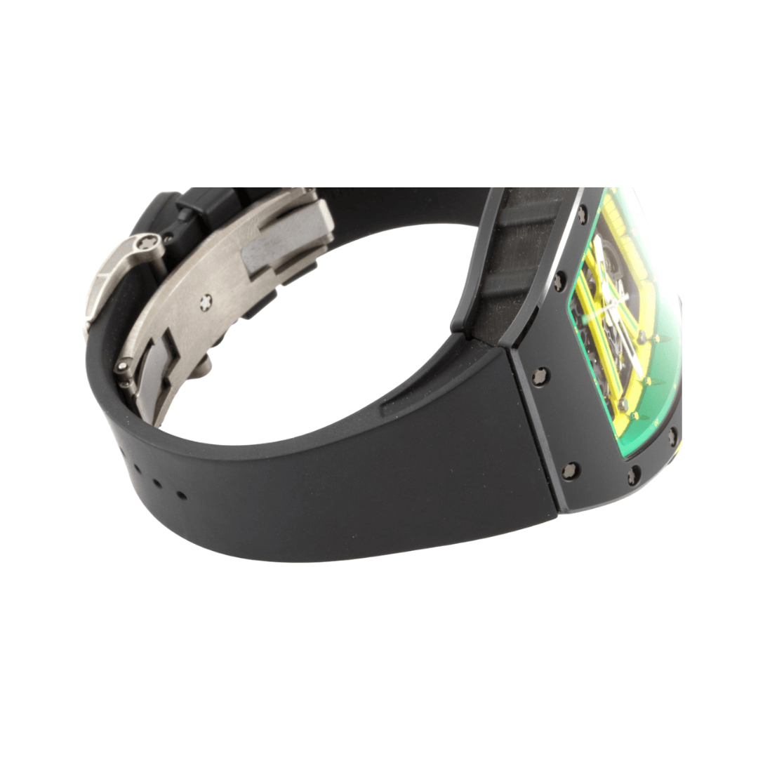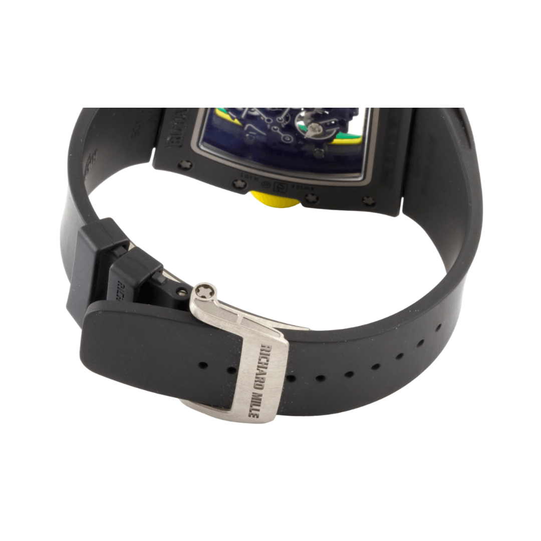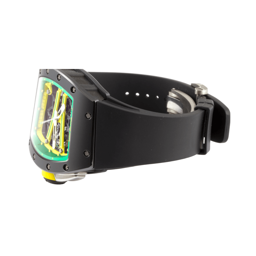 The Richard Mille RM61-01 Yohan Blake is equipped with a black rubber strap that offers both comfort and durability. The double-fold clasp ensures a secure fit on the wrist, providing peace of mind during everyday wear. The buckle material, made from titanium, complements the overall design while maintaining the watch’s lightweight feel.