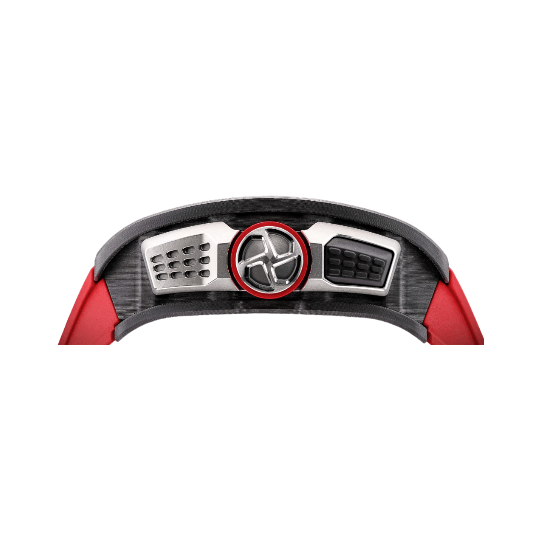 This watch stands out with its bold and innovative design. The case is made from Carbon TPT, a high-tech material known for its durability and lightweight properties. The case measures 54.88 x 49.48 x 17.65 mm, offering a substantial and impressive presence on the wrist.