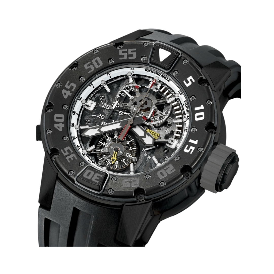 The case material is titanium, known for its strength and rust resistance. The bezel is made from carbon, a material that is both strong and stylish. This mix of materials not only looks unique but also adds extra durability to the watch. The bracelet is made of rubber, offering a soft and flexible fit. This makes it comfortable to wear every day, whether you’re dressing up or staying casual.