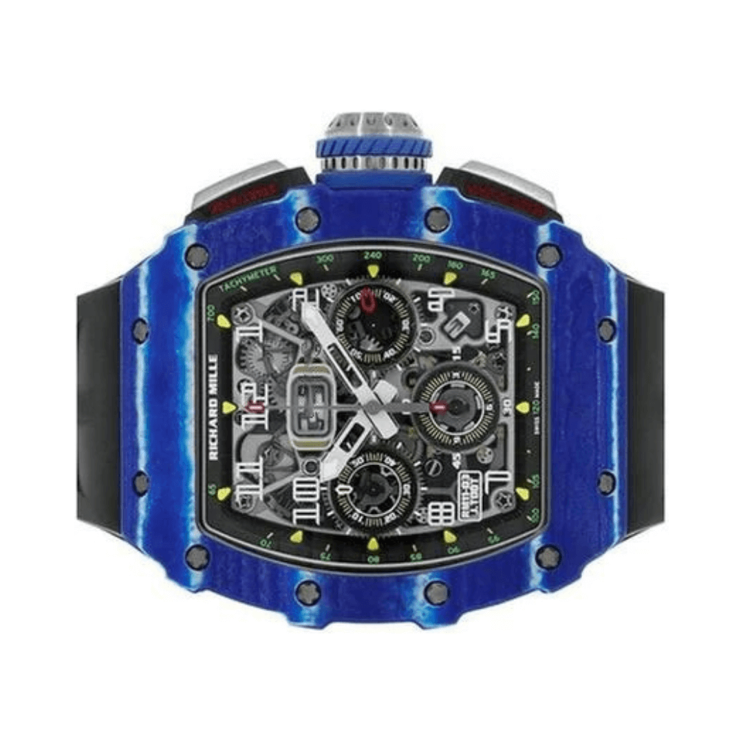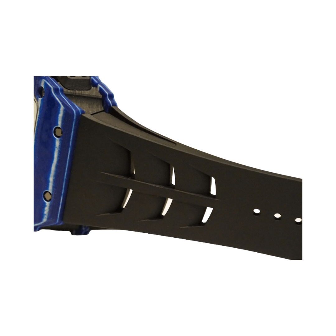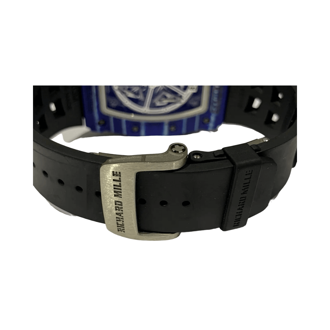 The watch is protected by a blue and white Quartz TPT case. This case is extremely resistant and lightweight, made by stacking 600 layers of silica that are only 45 microns thick. These layers are impregnated with a blue resin exclusive to Richard Mille, heated to 120°C, and then machined in the factory. This meticulous process ensures the durability and unique look of the watch.
