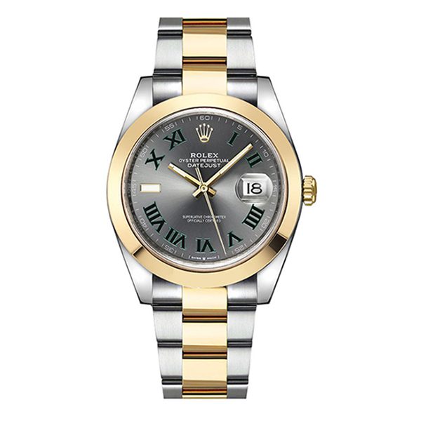 It has 18K yellow gold smooth bezel, scratch-resistant double anti-reflective sapphire crystal with cyclops lens over the date, slate dial, green Roman numerals, Rolex calibre 3235 perpetual self-winding movement with date at 3 o’clock that changes instantaneously at midnight in a few thousandths of a second.