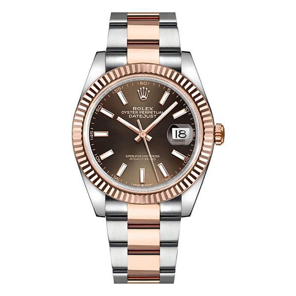 The Rolex Datejust 126331 CHOIO features 41mm Everose Rolesor case with 904L steel monobloc middle case, screw-down steel back, 18K Everose gold screw-down crown, 18K Everose gold fluted bezel, scratch-resistant double anti-reflective sapphire crystal with cyclops lens over the date, chocolate dial, index hour markers, Rolex calibre 3235 perpetual self-winding movement with date at 3 o’clock that changes instantaneously at midnight in a few thousandths of a second, approximately 70 hours of power reserve, Everose Rolesor Oyster bracelet made from a combination of 904L steel and 18K Everose gold with flat three-piece links, folding Oysterclasp buckle with Easylink 5mm comfort extension link. Waterproof to 100 meters.