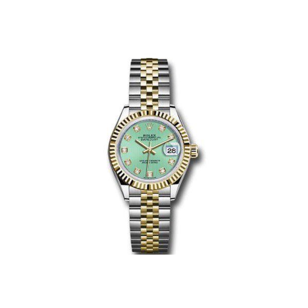 28mm yellow Rolesor case comprised of a 904L steel monobloc middle case, screw-down steel back, 18K yellow gold screw-down crown with twinlock double waterproofness system, 18K yellow gold fluted bezel, scratch-resistant sapphire crystal with cyclops lens over the date and double anti-reflective coating, mint green dial, diamond hour markers, Rolex calibre 2236 automatic movement with center hour, minute and seconds hands, instantaneous date with rapid setting, and stop-seconds for precise time setting, yellow gold Rolesor Jubilee bracelet comprised of a combination of 904L steel and 18K yellow gold in five-piece links, concealed folding Crownclasp buckle. Waterproof to 100 meters.