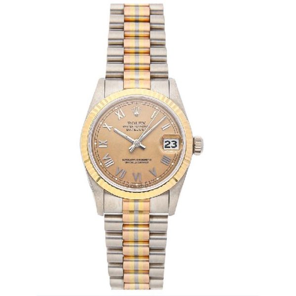 three colour gold; white rose and yellow gold. President bracelet, champagne dial with roman numerals, 18k yellow gold fluted bezel.