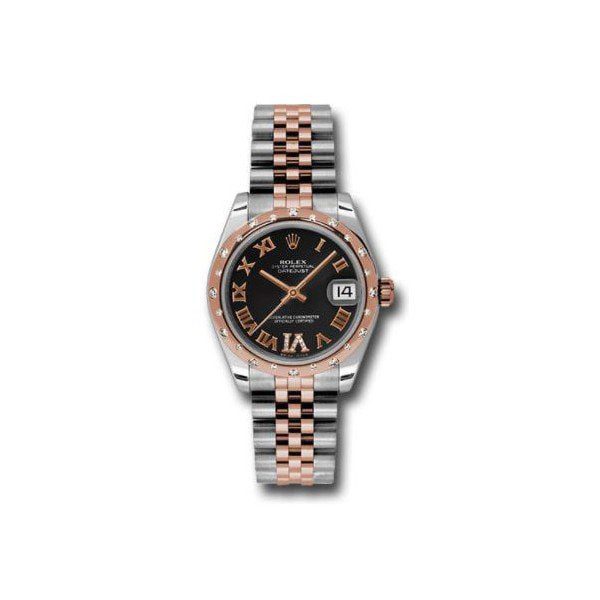 31mm stainless steel case, 18K pink gold domed bezel set with 24 diamonds, black diamond Roman VI dial, Roman numerals with 11 diamonds set on VI, and stainless steel and 18K pink gold Jubilee bracelet.
