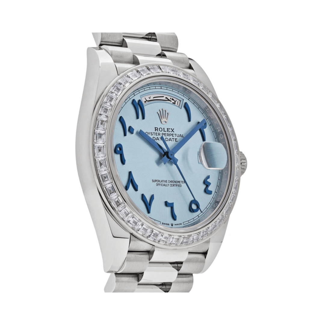 This Rolex watch has an ice blue dial that enhances its sophisticated look. The dial features Eastern Arabic numerals, making it a distinctive and sought-after timepiece. It includes a sweep center seconds hand and an Arabic calendar, ensuring both style and functionality.