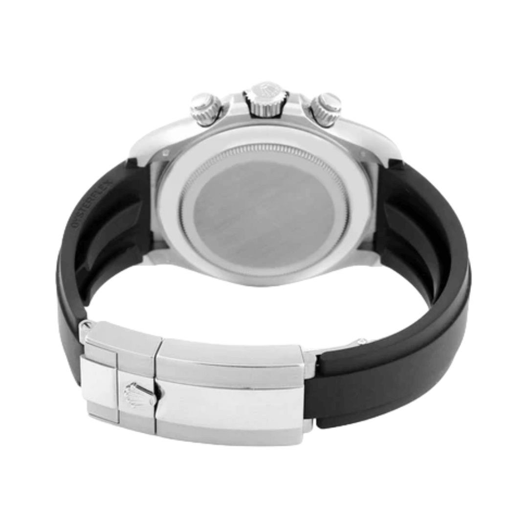 Equipped with a comfortable and durable Oysterflex rubber strap, this Rolex Daytona watch offers a blend of style and practicality. The Oysterflex bracelet combines the resilience of rubber with the luxury of a Rolex, providing a secure and comfortable fit. This unique strap design adds a modern touch to the watch, making it versatile and suitable for active lifestyles.