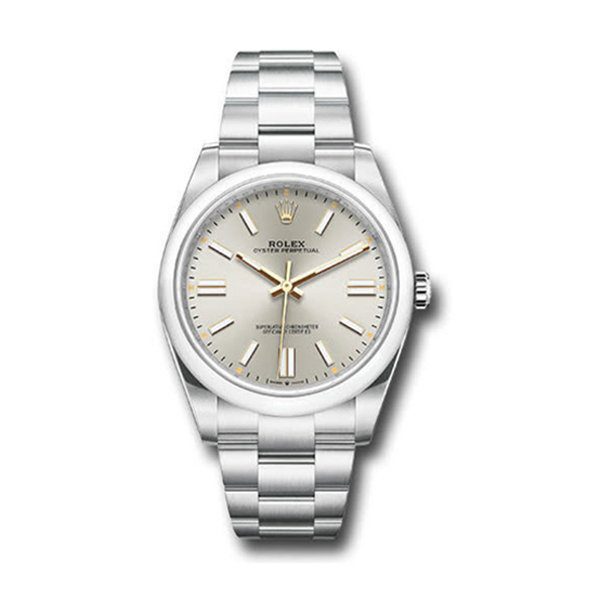 41mm Oystersteel case, screw-down crown with twinlock double waterproofness system, domed bezel, scratch-resistant sapphire crystal, silver dial, index hour markers, Rolex calibre 3230 automatic movement with center hour, minute and seconds hands, and stop-seconds for precise time setting, approximately 70 hours of power reserve, Oyster bracelet with flat three-piece links, folding Oysterclasp buckle with Easylink 5mm comfort extension link. Waterproof to 100 meters.