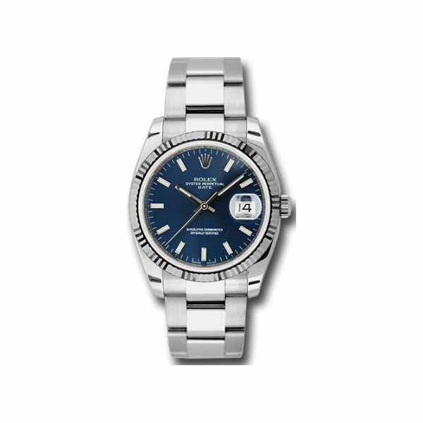 34mm polished stainless steel case, 18K white gold fluted bezel, blue dial, index hour markers, and Oyster bracelet with brushed outer links and polished center links.