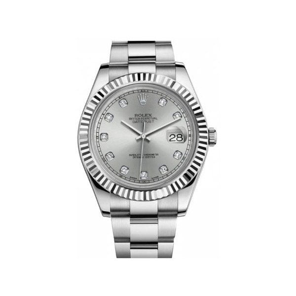 41mm Rolesor case in stainless steel with 18K white gold fluted bezel, silver dial, diamond hour markers, and stainless steel Oyster bracelet with Oysterclasp and Easylink extension link. Water resistant to 100 meters.