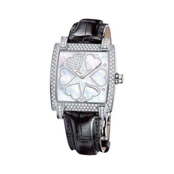 34 x 35mm stainless steel case with diamonds, diamond bezel, mother-of-pearl dial with 6 hearts and diamonds, caliber 11 1/2″ UN-13 self winding movement, approximately 60 hours of power reserve, black leather strap. Water resistant to 50 meters.