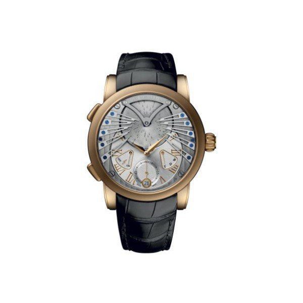 45mm 18kt rose gold case, self winding, scratch resistant sapphire crystal, folding buckle clasp, black strap, water resistant to 30m/100ft.