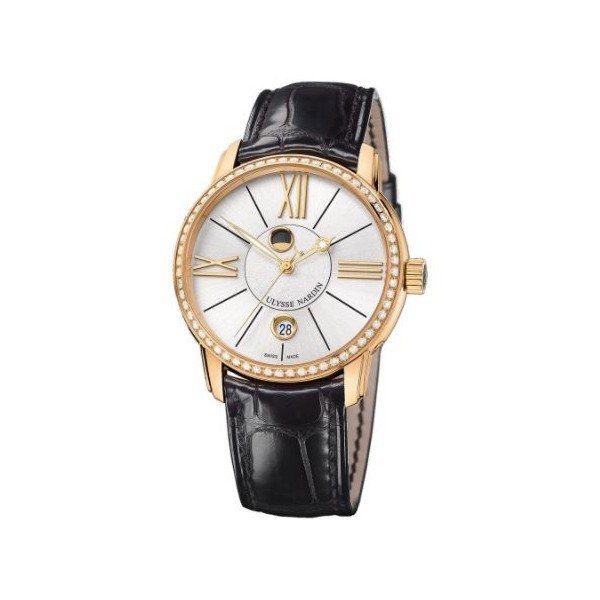 40mm 18K rose gold case set with diamonds, silver dial, self-winding movement, approximately 42 hours of power reserve, black leather strap with standard buckle.