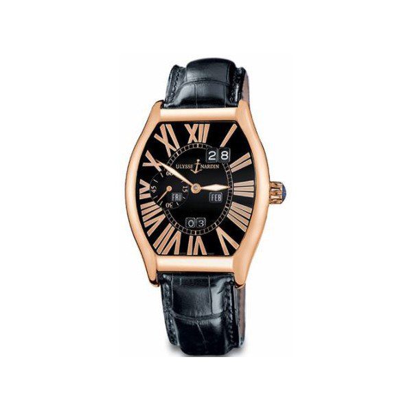 38 mm x 43 mm 18kt rose gold case, 15 mm thickness, black dial, fixed bezel, solid case back, scratch resistant sapphire crystal, deployant buckle clasp, automatic movement, black leather strap, water resistant to 50m/165ft.
