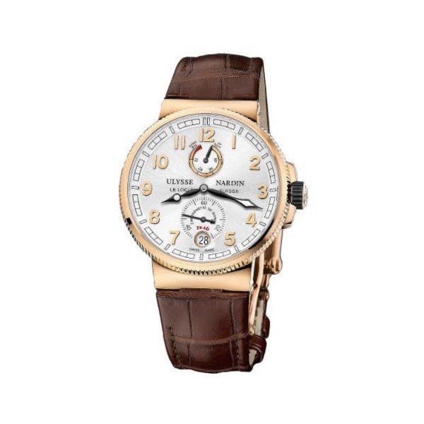 43 mm 18kt rose gold case, 13.85 mm thickness, silver dial, fixed bezel, scratch resistant sapphire crystal, push/button folding clasp, transparent case back, brown leather strap, water resistant to 100m/330ft.