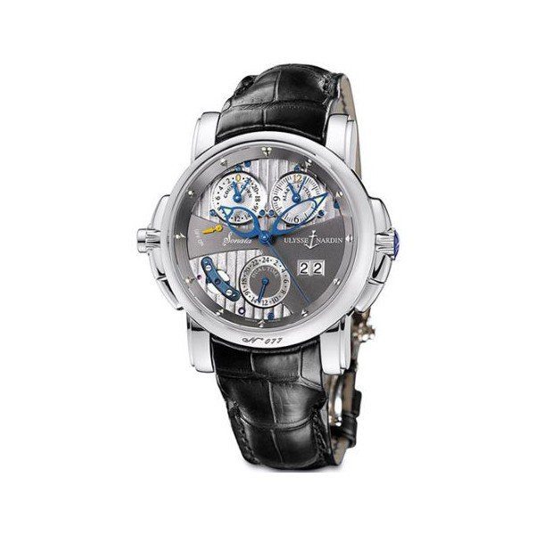 42mm 18kt white gold case, 13mm thickness, fixed bezel, screw down crown, transparent case back, scratch resistant sapphire crystal, black leather strap, automatic movement, slate grey on a silvered dial, water resistant to 30m/100ft.