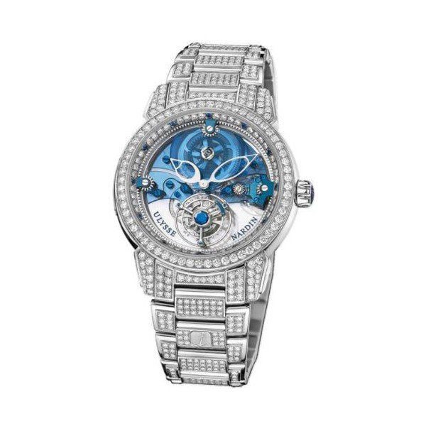 Royal Blue Tourbillon, Limited edition to 99 pieces, 41 mm platinum case, transparent dial, transparent case back, screw down crown, manual wind movement, power reserve 100 h,?Platinum strap set with diamonds, water resistant to 30m/100ft.