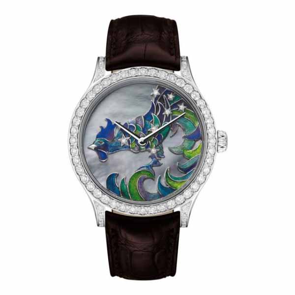 Limited Edition of 22 pieces, 42mm 18kt white gold case, Mother of pearl and 18kt white gold dial is adorned with champlev and vallonne enamel, diamond bezel, brown leather bracelet with a white gold folding buckle set with round diamonds.