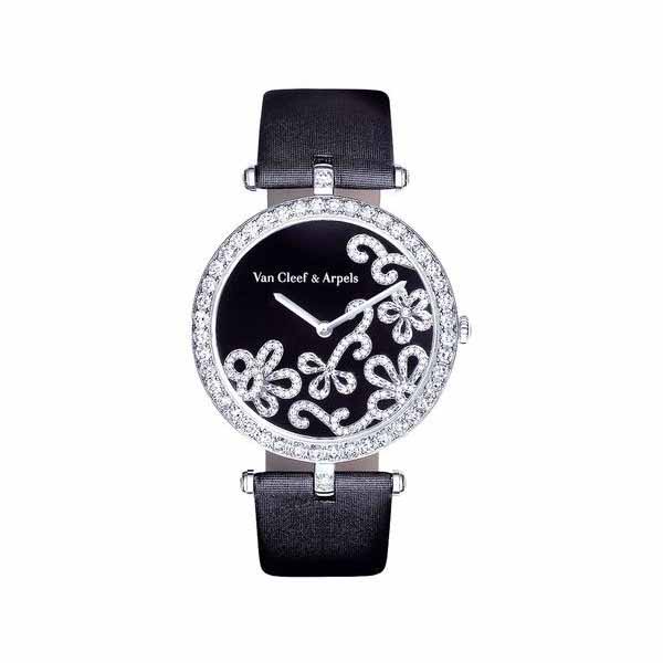 36mm 18kt white gold case, quartz movement, diamond bezel, scratch resistant sapphire crystal, buckle clasp, black satin strap, water resistant to 30m/100ft.
