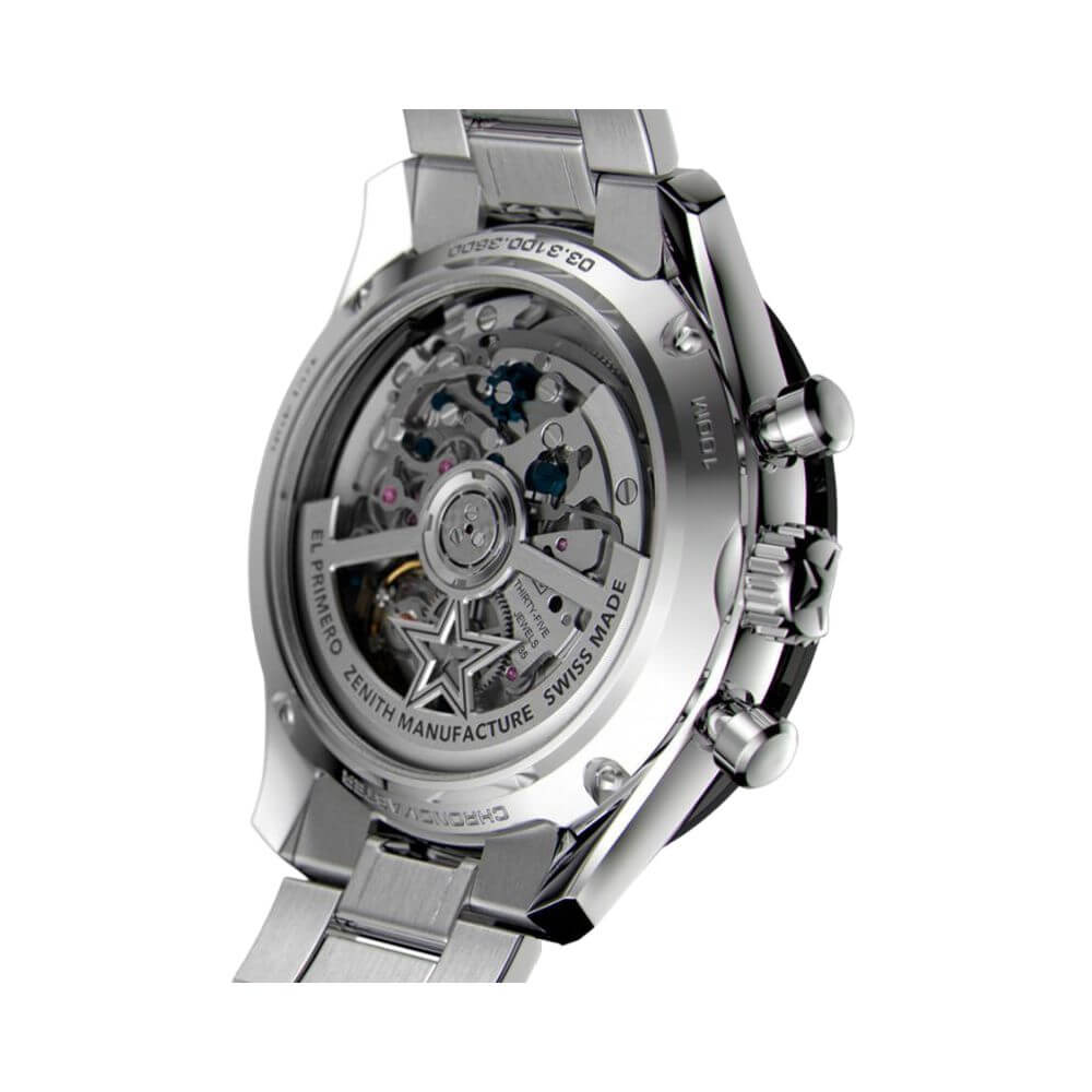 Inside this timepiece beats an automatic movement, a testament to Zenith’s commitment to excellence. The round case shape and stainless steel bracelet add to its sporty and sophisticated look.