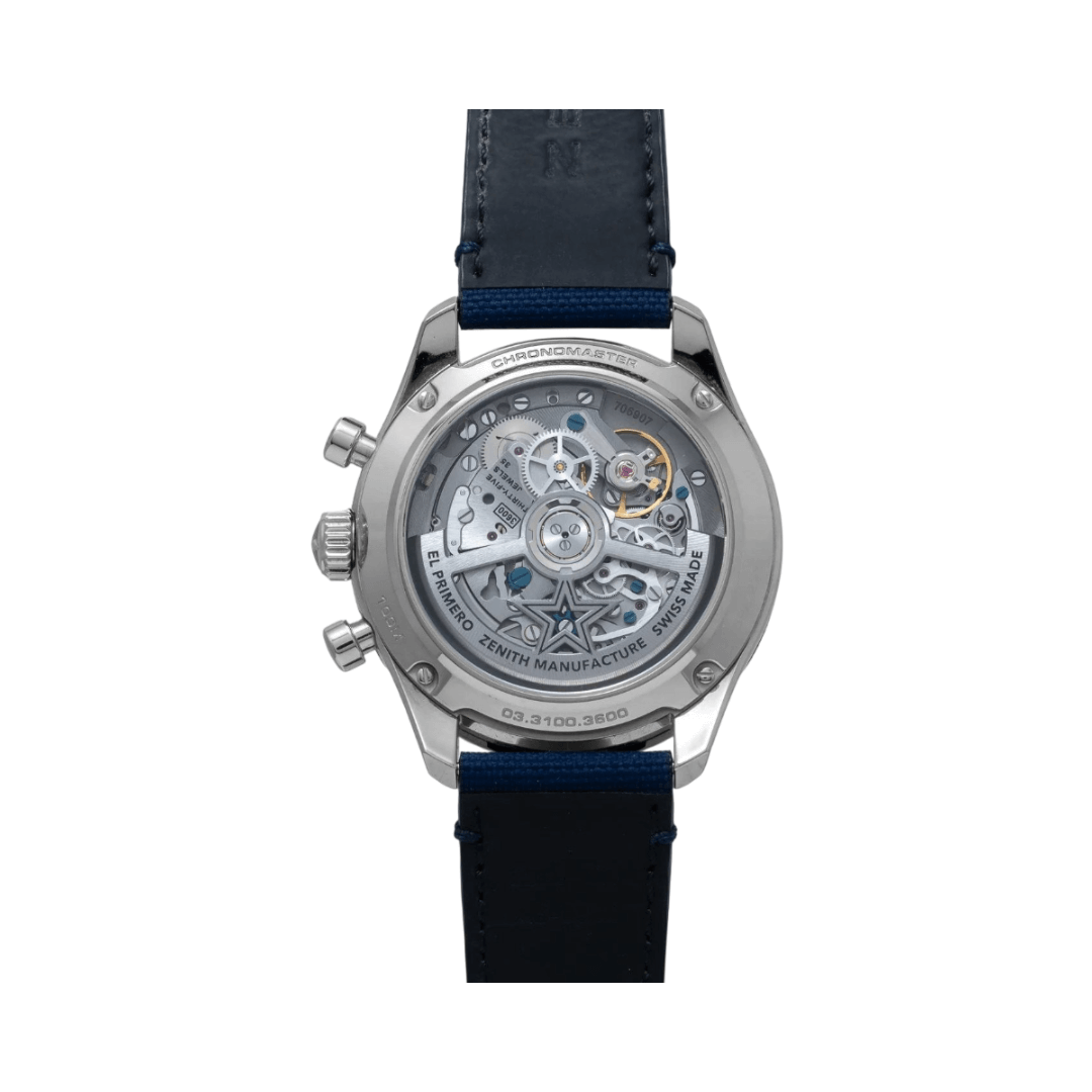 This timepiece is powered by Zenith’s El Primero 3600 automatic movement, offering precise 1/10th of a second chronograph timing and a 60-hour power reserve. It includes useful functions such as a date display, small seconds, and a central chronograph hand. The movement is visible through a see-through case back, showing off Zenith’s watchmaking craftsmanship.